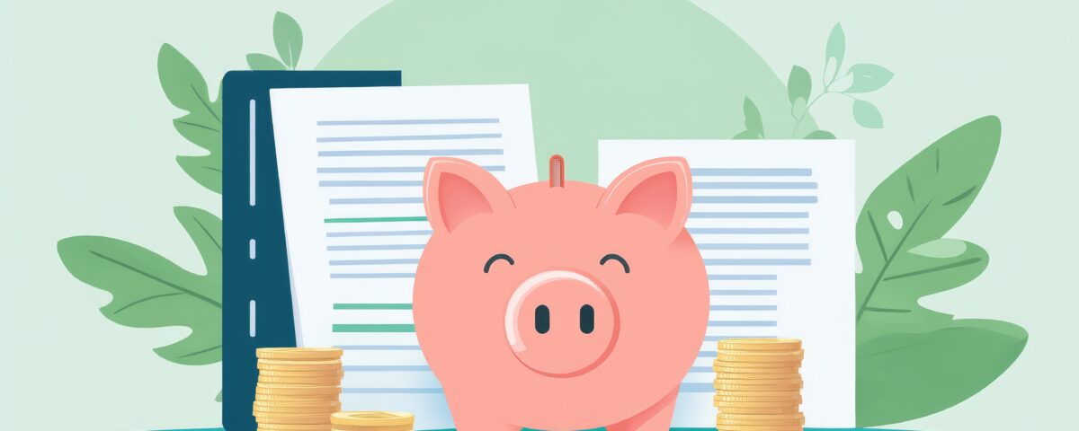 A piggy bank with coins in it. The coins are in a pile. There are also some papers on the ground